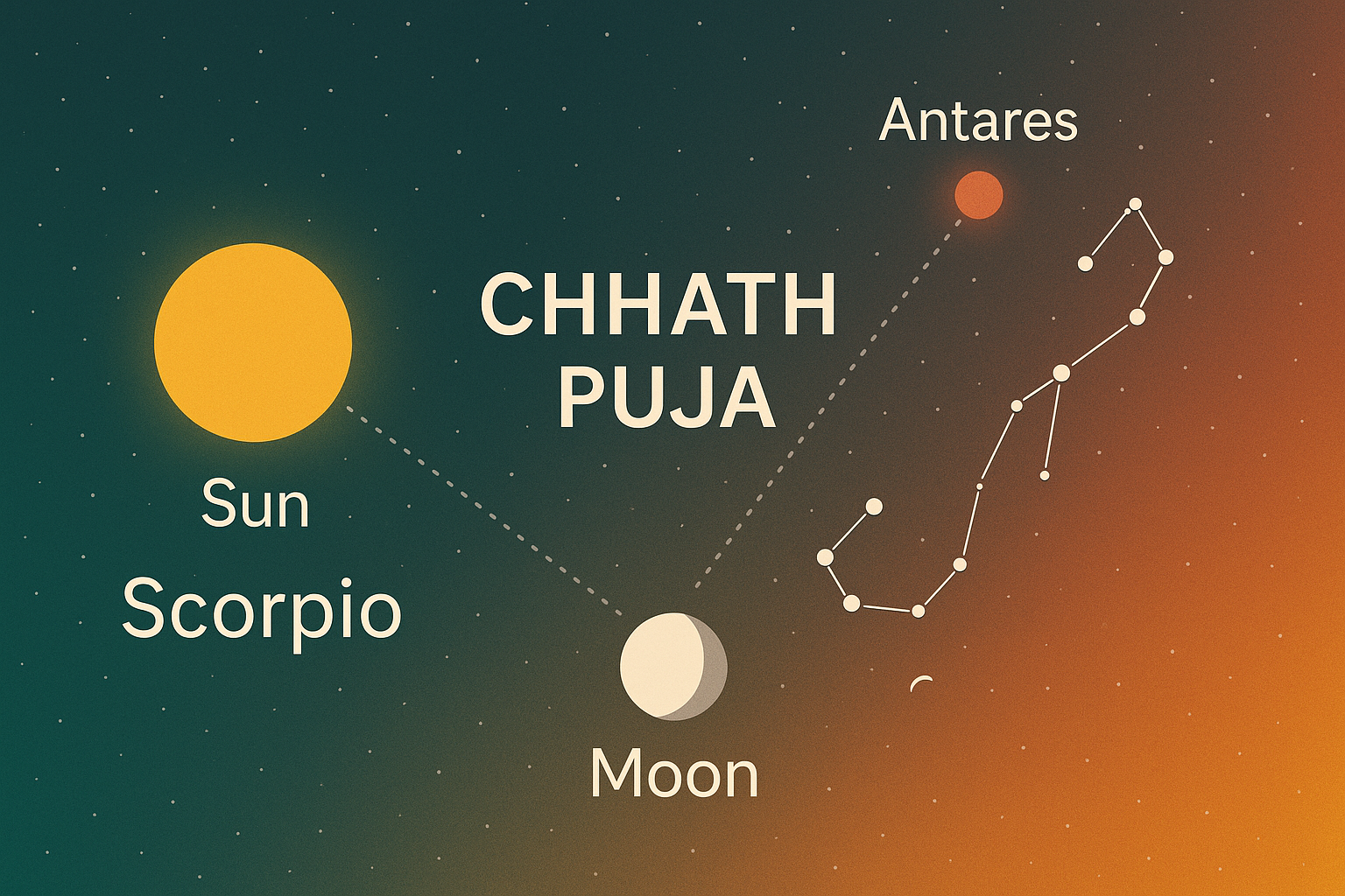 • The Moon during Chhath Puja typically transits Anuradha or Jyeshtha Nakshatra, close to Antares (Alpha Scorpii) — a bright red star in the heart of Scorpio.